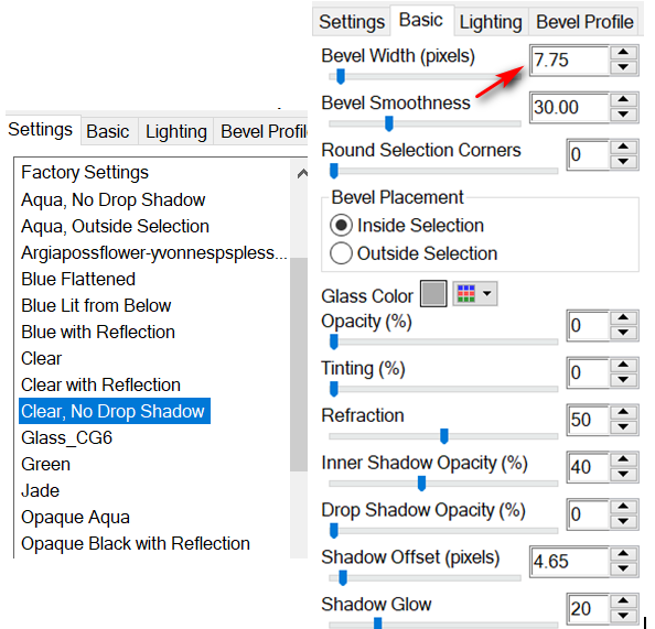 Puis dans basic : 7.75 sur Bevel Width (pixels)